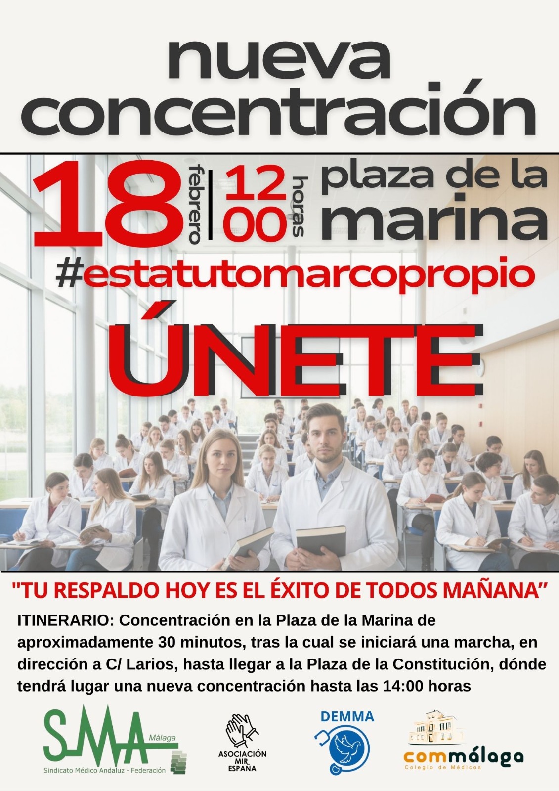 El Colegio de Médicos de Málaga prosigue con su lucha, junto a Sindicato Médico de Málaga, Asociación MIR España y la Delegación de Estudiantes de Medicina de la Universidad de Málaga (Demma) contra la reforma del Estatuto Marco del Ministerio de Sanidad. Para ello anima a la participación en la concentración y posterior marcha organizada por el Sindicato Médico de Málaga que tendrá lugar el miércoles 18 de febrero desde las 12:00 horas en la Plaza de la Marina de la capital malagueña.
