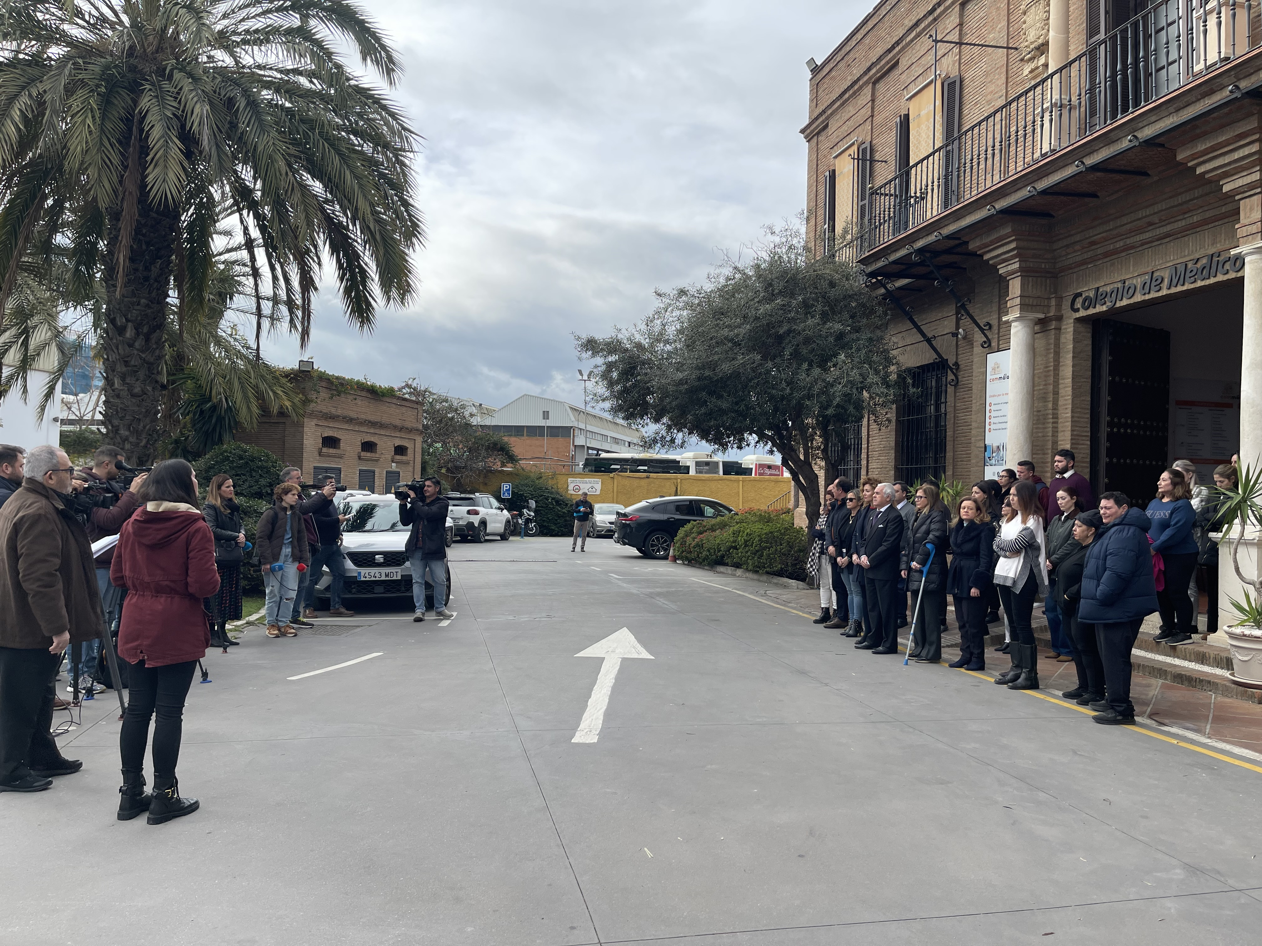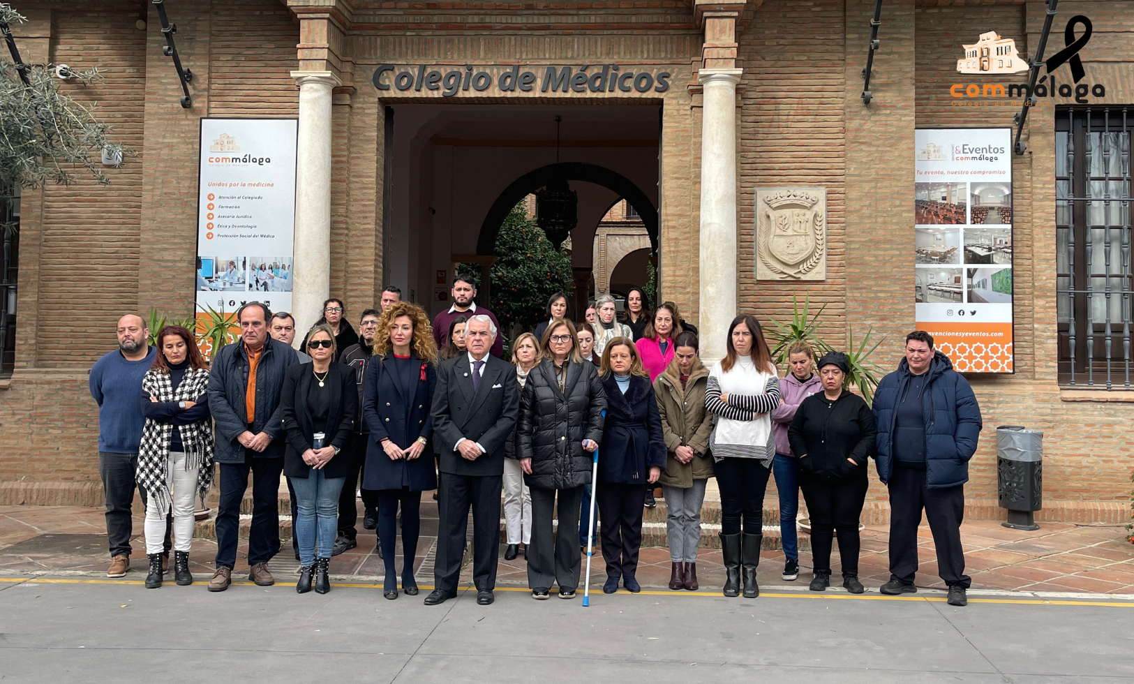 La concentración tuvo lugar en la fachada de la sede de la corporación y a ella acudieron el presidente del Colegio, Dr. Pedro J. Navarro; la vicesecretaria, Dra. Virginia Ortega; la vocal de la entidad, Dra. Teresa Fuentes; y los trabajadores del Commálaga, entre otros.