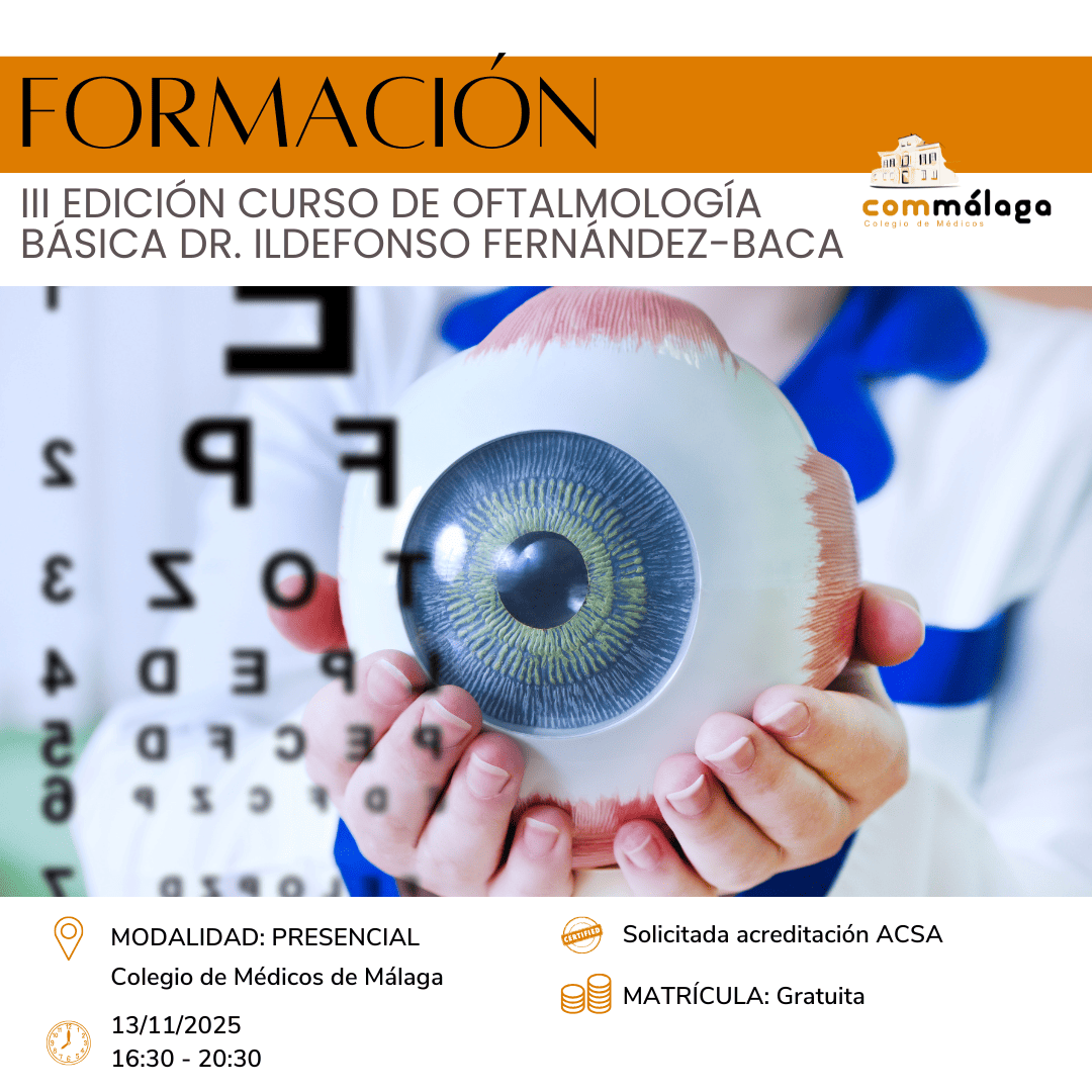 El Área de Formación del Colegio de Médicos de Málaga organiza el III Curso de Oftalmología Básica Dr. Ildefonso Fernández-Baca, que se celebrará en las instalaciones de Convenciones & Eventos Commálaga el 13 de noviembre de 2025 16:30 a 20:30 horas. Se trata de una actividad gratuita dirigida por la Dra. Carmen Alba Linero.