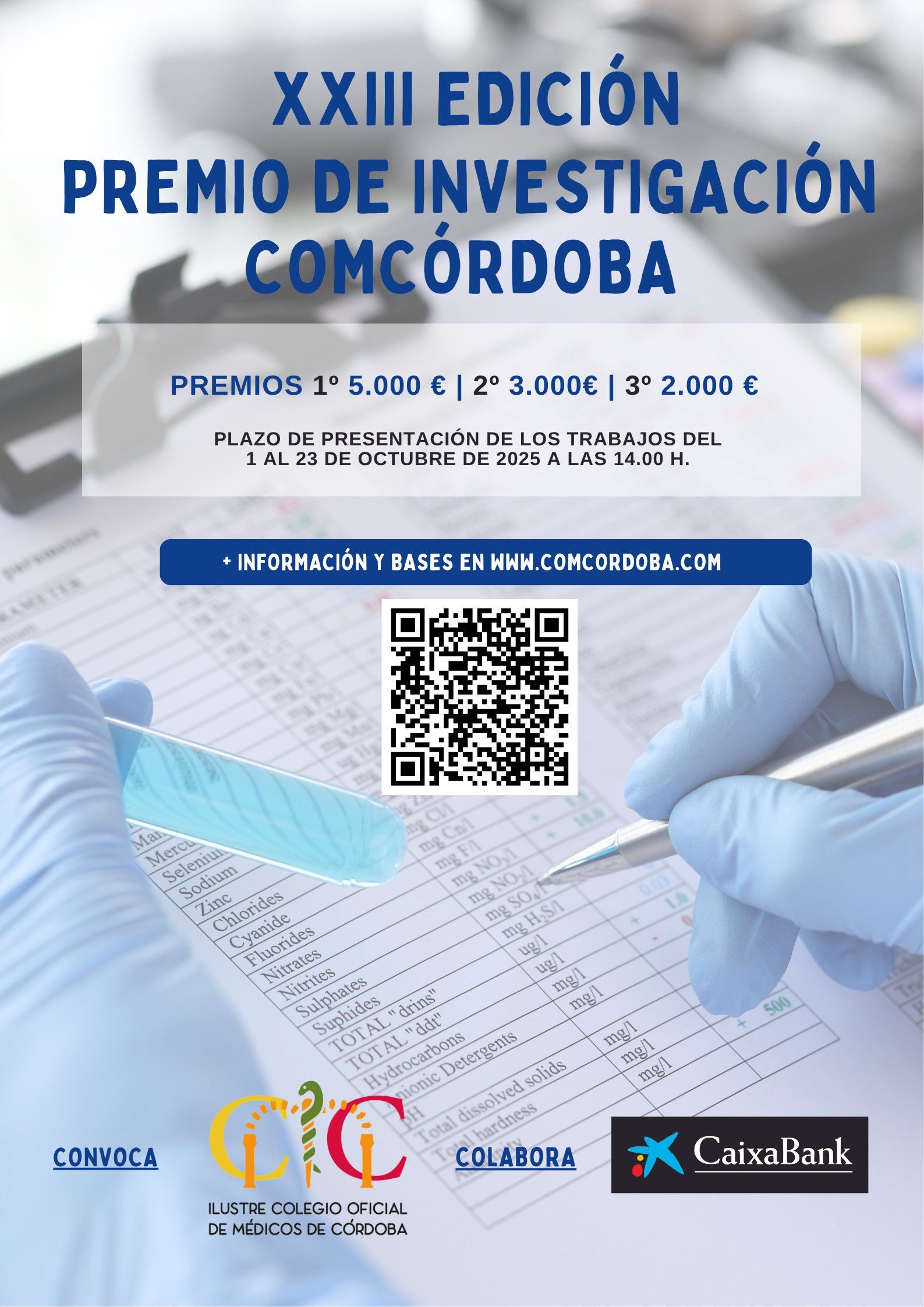 El Ilustre Colegio Oficial de Médicos de Córdoba convoca el XXIII Premio de Investigación dirigido a médicos colegiados en España. Patrocinado por CaixaBank.